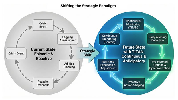 Note. This figure contrasts the current U.S. model of crisis-driven response, lagging assessment, and ad hoc planning with a TITAN-enabled future state characterized by continuous monitoring, early warning detection, real-time feedback and adjustment, and preplanned options and synchronization. It supports the paper’s claim that strategic advantage increasingly belongs to systems that detect risk accumulation early and coordinate action faster than competitors.