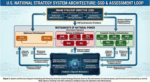 Together, the system enables continuous strategic assessment, early warning, and interagency synchronization, transforming U.S. strategy from episodic narrative planning into a data-driven architecture for anticipatory governance and national decision superiority.